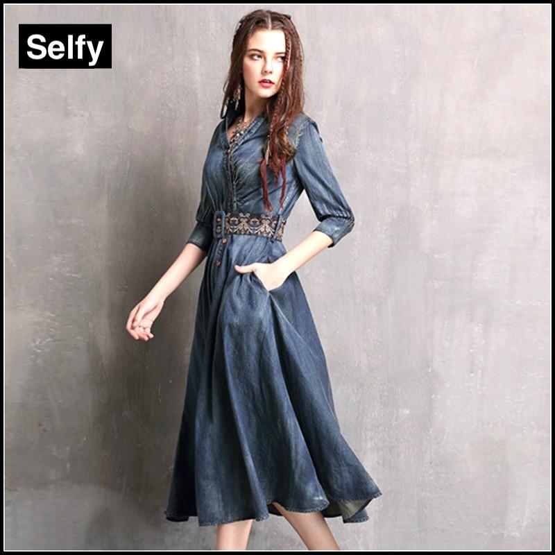 デニムワンピース コーデ 40代 刺繍 シャツワンピース レトロ ワンピース 民族衣装 ウエストベルト ネイビー 刺繍入りフレアスカート 7部 ミモレ丈 ワンピース pr04nv7 001 Selfy 通販 Yahoo ショッピング